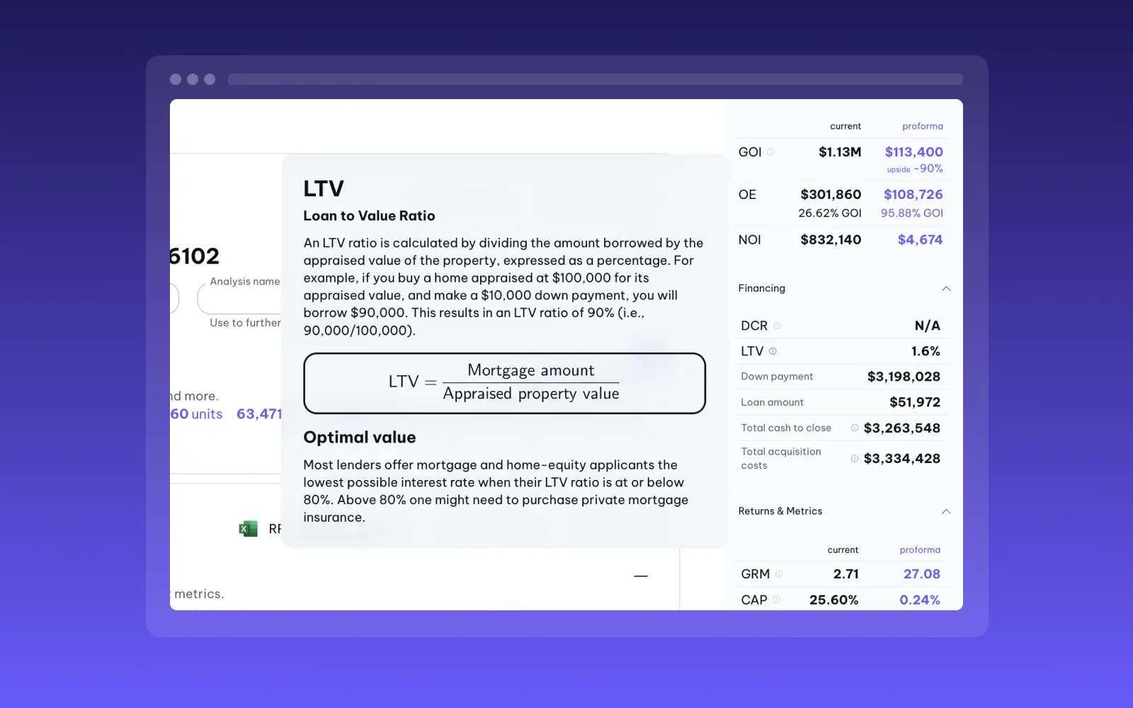 The loan to value ratio (LTV) is a common metric used in commercial real estate analysis and computations. LTV represents the amount of loan given by the bank compared to the value of the commercial property. It is calculated by dividing the loan amount by the value of the property and expressed as percentage. In this post, we review the LTV formula, how to calculate it, what is its significance, and how it is used in real estate financing. We include examples of how to use the LTV ratio in calculations.